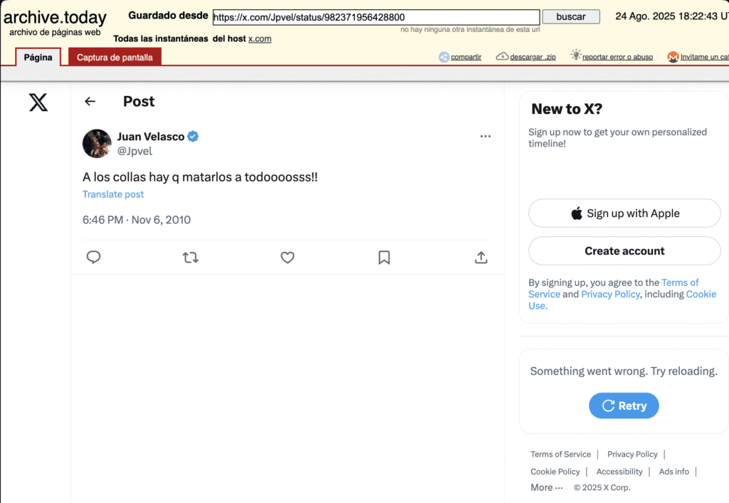 El archivo capturado, accesible en el enlace: https://archive.ph/HnSpJ, confirma sin lugar a dudas que la cuenta verificada de Juan Pablo Velasco efectivamente contenía la frase de incitación al odio y a la violencia: «a los collas hay que matarlos a todos». Este contenido, además de ser una ofensa racial, constituye un llamado a delinquir.